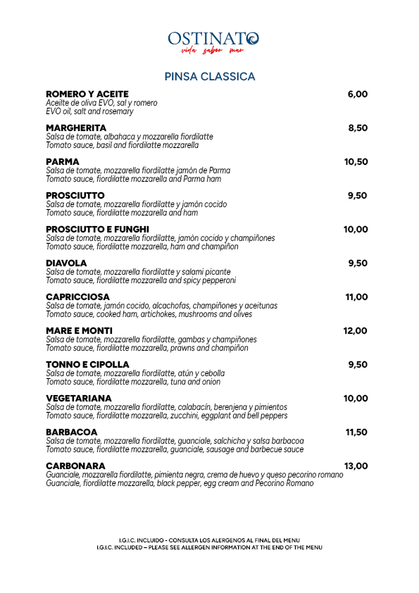 Las pinsas romanas originales son otro de nuestros pilares: masa crujiente por fuera y ligera por dentro, fermentada y horneada para garantizar digestibilidad, y siempre condimentada con ingredientes de óptima calidad.